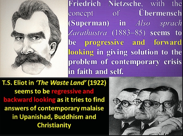 Of course T. S. Eliot and Nietzsche use different, or totally opposite method to solve the problem of contemporary crisis. One (Eliot) use to be regressive and backward looking as it tries to find answers of contemporary malaise in Upnishad, Buddhism and Christianity, while Nietzsche, sees to be progressive and forward looking in giving solution to the problem of contemporary crisis in faith and self. Here if I share my opinion then I would like to say that Eliot has achieved universality of thought by recalling mytho historical by using Upnishad, Buddhism and Christianity, to answer the contemporary malaise. In "The Waste Land" Like by using myths he present the hollowness of human being in modern times. Of course it's good Nietzsche's use of progressive and forward looking, it's quite helpful to solving the problem of contemporary crisis in faith and self, but here in 'the Waste Land' it's quite apt to use of Upnishad, Buddhism and Christianity.